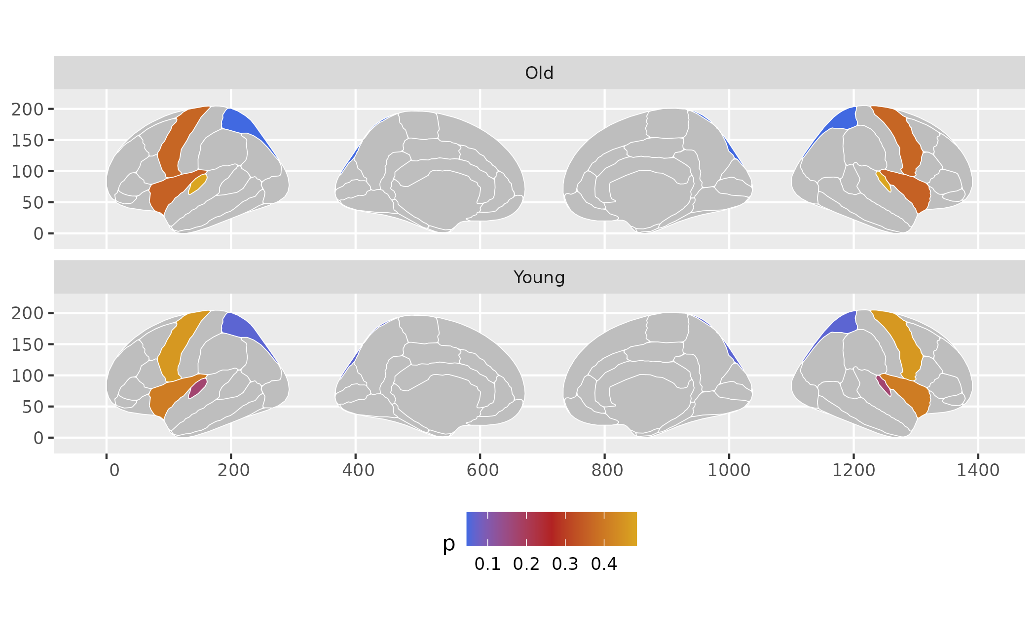 ggplot(some_data) + geom_brain(atlas = dk, mapping = aes(fill = p))## merging atlas and data by 'region', 'hemi'
